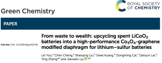 近日,团队在国际知名学术期刊《Green Chemistry》上发表题为“From waste to wealth: upcycling spent LiCoO₂ batteries into a high-performance Co₃O₄-graphene modified diaphragm for lithium–sulfur batteries”的研究论文,提出了一种将废弃钴酸锂电池转化为高性能锂硫电池隔膜修饰材料的创新策略,实现了“变废为宝”的绿色闭环利用。该论文由尤雷博士担任第一作者,刘建文教授担任通讯作者。